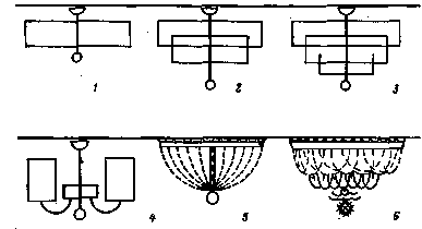 1 — одноярусная люстра из крупных элементов; 2 — двухъярусная; 3 — трехъярусная; 4 — рожковая с рассеивателями в виде стаканов, с лампами, размещенными внутри; 5 и 6 — кольцевое построение люстр с декором из нитей с мелким хрусталеи-бусами
