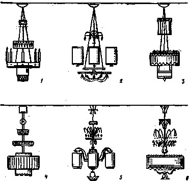 Схемы компоновки подвесных светильников для комбинированного освещения обеденного стола и общего освещения комнаты: / — кольцевая люстра с имитацией свечей по периферии для праздничного освещения и центральной светящей частью для освещения обеденного стола и подсветки помещения светом, отраженным от потолка; 2 — кольцевая люстра с рассеивателями в виде хрустальных граненых стаканов; 3 — кольцевая хрустальная люстра с лампами накаливания малой мощности н центральным источником света для освещения стола и подсветки потолка; 4 — двухъярусная стержневая люстра (остальные данные, как в поз. 3); 5 — одноярусная стержневая люстра с рассеивателями-стаканами; 6 — одноярусная стержневая люстра с хрустальным «поясом> из крупногабаритных элементов