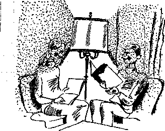 Некоторого разнообразия можно достичь, применив напольные светильник с двумя или тремя лампами, каждая из которых будет заключена в отдельно выделенную светящую часть. Каждая из частей должна иметь устройство (шарнир, гибкий шланг), обеспечивающее изменение положения светящей части в пространстве. Все части напольного светильника делаются обычно одинановыми — световой поток выходит лишь в одном на-; правлении. Это позволяет не только осветить объект работы, но и направить световой поток другого источни-ка света на потолок и получить за счет отраженного от него света необходимое общее освещение в зоне. Если оставить включенной только одну часть светильника, световой поток которой направить на потолок, то при мощности 60 Вт в комнате площадью 18—20 м* можно получить световую обстановку, необходимую для просмотра телепередач.