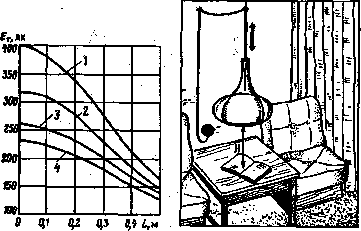 Изменение горизонтальной освещенности при различной высоте установки светильника над столом, м: / — 0,5; 2 — 0,6; 3 — 0,7; 4 — 0.8